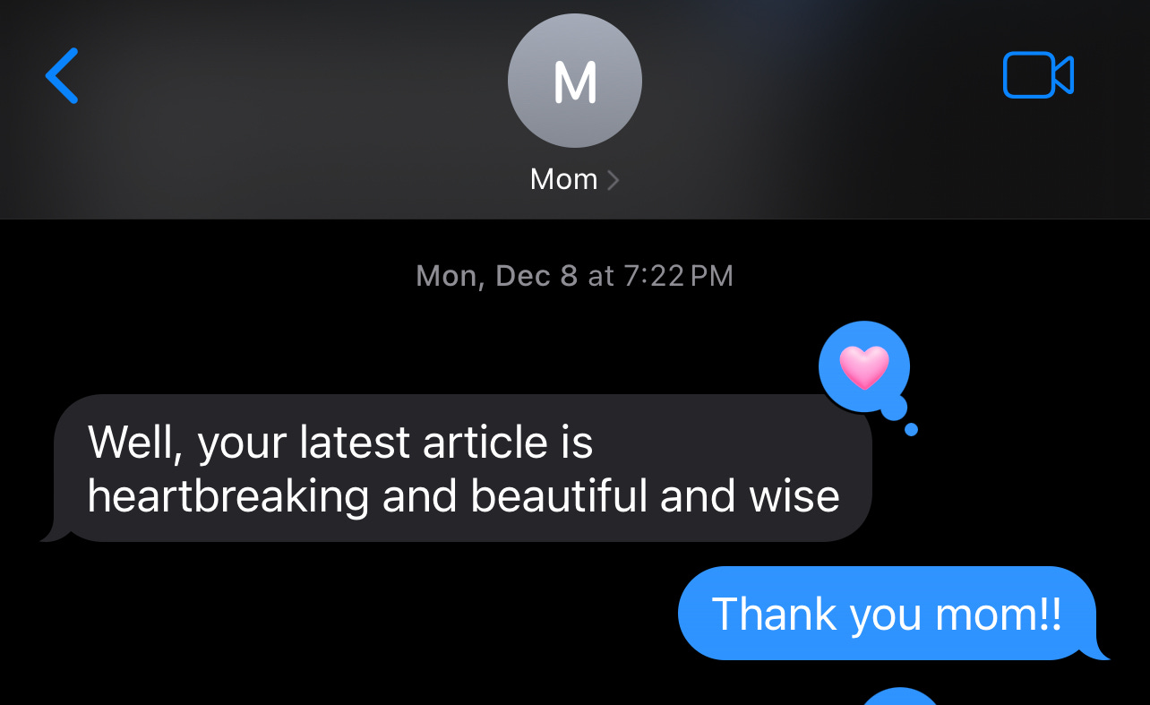 Instead, I want to take a minute to acknowledge this newsletter’s first and greatest supporter, the person who has encouraged and praised my writing since I was 6 years old, and who has masked and protected me from COVID reinfections without protest: my mom.