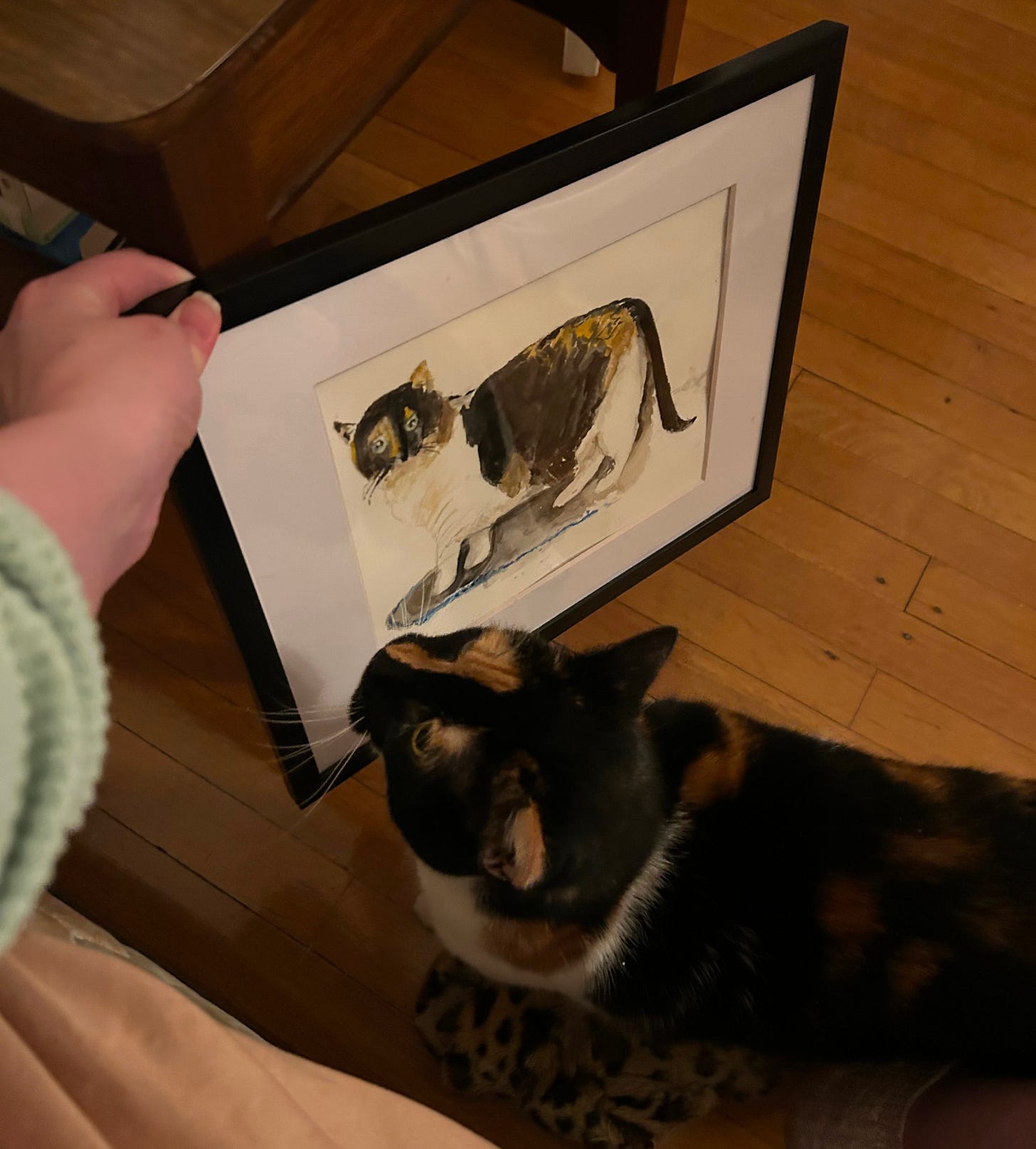 The last painting she ever completed was of my beloved cat, Beatrice. She didn’t want to finish it because her symptoms were worsening, and she didn’t feel it was up to her usual standards. I’m so glad she did. Last April, she showed my brother and I the finished painting over Zoom, and last July, during her final visit to my apartment in DC, she brought me the painting in a frame.