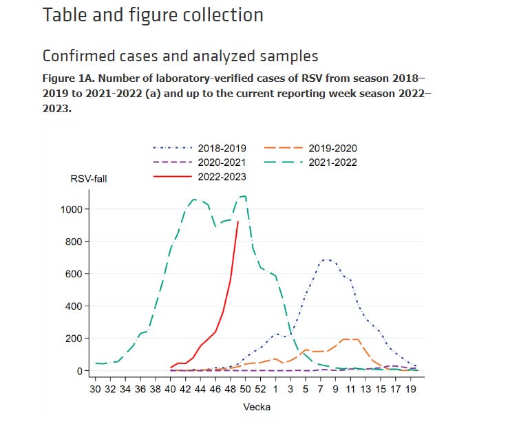 First: pediatric illness is surging even in regions that never had lockdowns or masking. The premise itself- the idea that children were well-protected from illness for over two years by harsh lockdowns (lol) and infection controls, is false. In 2020 there were a lot of measures in place, and illness was quite low during that season. But by last winter, most measures had been relaxed, and any continued masking in schools was offset by parents throwing caution to the wind and taking their kids travelling and socializing in the post-vaccine era. In some places, RSV cases were actually quite high last year- it’s only the severity that has changed, meaning more children are being hospitalized per the number of total infections. Add to that, 90% of American children have now had at least one COVID infection, meaning that yes, they have been getting exposed to germs and no, they were not well protected over the last 2.5 years.