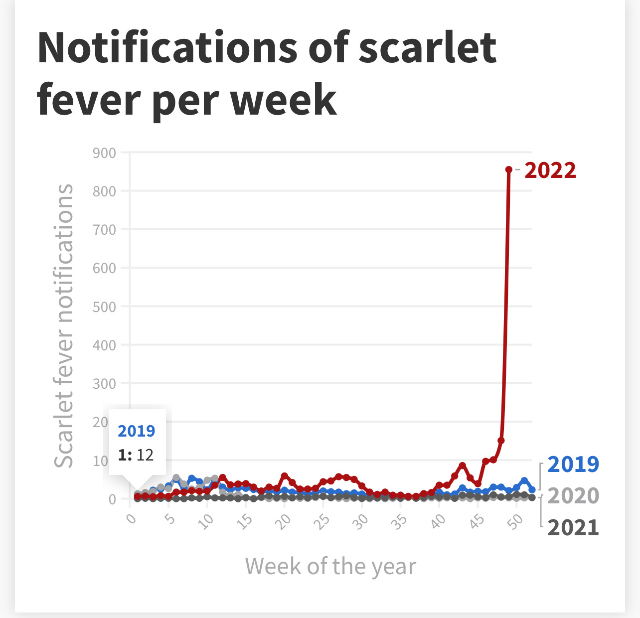Wales reports more than 850 scarlet fever cases in a single week: The average number of scarlet fever cases for the same week over the previous three years was around 25. So, about 35x more cases than pre-COVID norm.