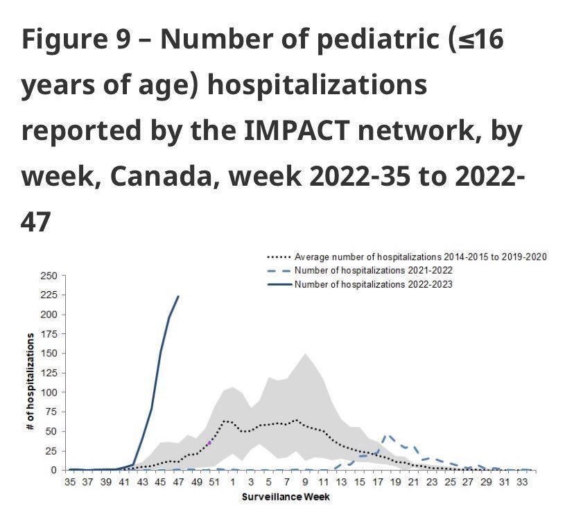 Canada is in the throes of a severe pediatric hospitalization crisis; the chart below shows that average pre-pandemic norms of pediatric admissions for this time of year were below 25. In the 2022 season, those admissions are at 225, or 9x the norm.