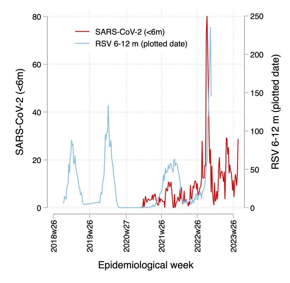 Fourth, when we look closely at the different cohorts of children (meaning different segments of the pediatric population grouped by age), we see that children who did not get RSV as babies did better with their delayed RSV infections than children infected earlier. This not only does not bear out “immunity debt,” it shows the opposite is true: delaying infection in young children and particularly new babies produces better outcomes, not worse. In fact, the children who are sickest are those who were born after the lockdowns and masking were already over! In the chart below, we can see that children aged 6-12 months had a massive spike in COVID infections before seeing an almost exactly equivalent spike in RSV infections.
